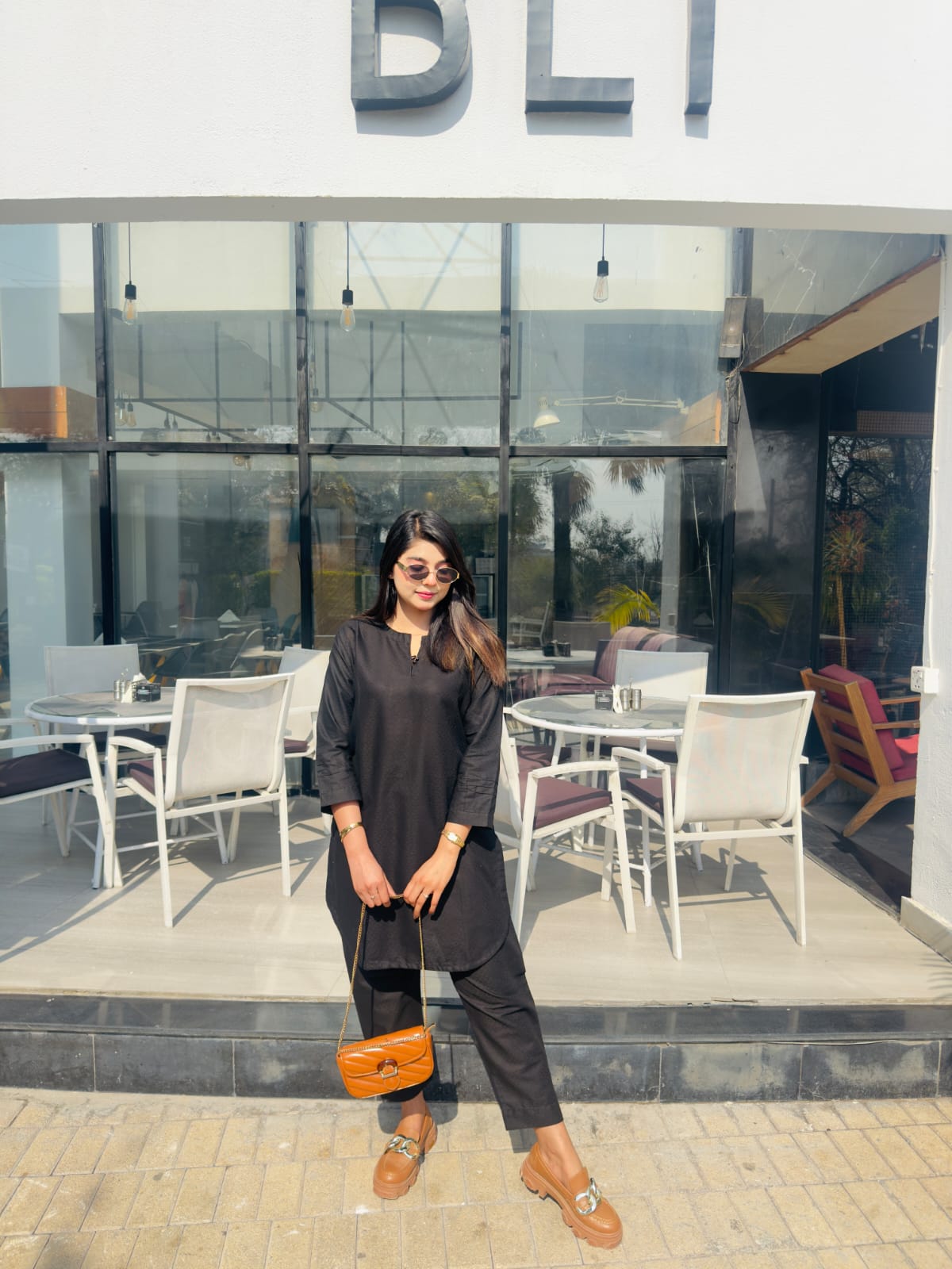 Design Features: unstitched Plane Black Fabric and matching front buttons, pintex on sleeves and trouser, design providing a modern yet traditional look.